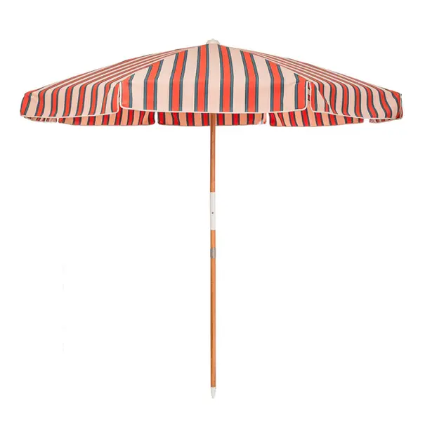 Striped red and pink umbrella. Canopy Span: 6.5’ x 7' HPole Diameter: 1.25"Weight: 12 lbs