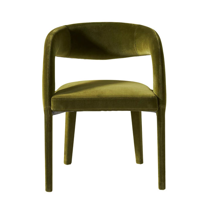 Elegant velvet chair in muted olive with refined, timeless silhouette.31"H, 23.5"W, 24"D