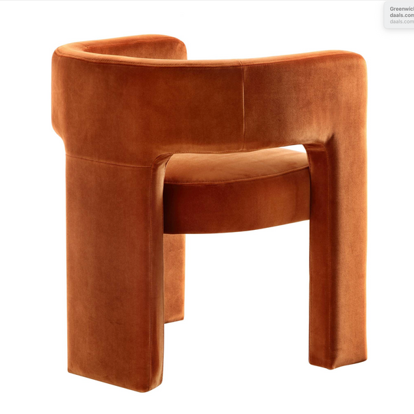 Chunky rust velvet chair with geometric arms and striking architectural form.W 22.8 x D 19.7 x H 26.6"
